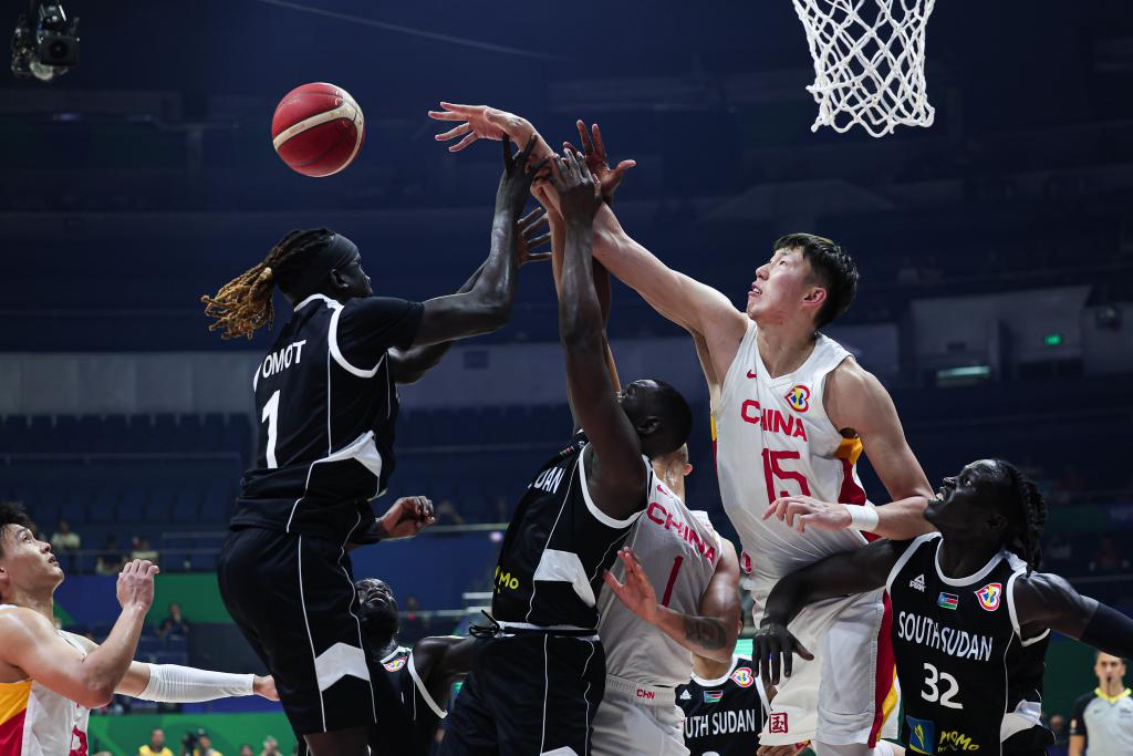 8月28日,中國隊(duì)球員周琦(右二)在比賽中拼搶。當(dāng)日,在菲律賓馬尼拉舉行的2023年籃球世界杯B組小組賽中,中國隊(duì)以69:89不敵南蘇丹隊(duì)。新華社記者 吳壯 攝