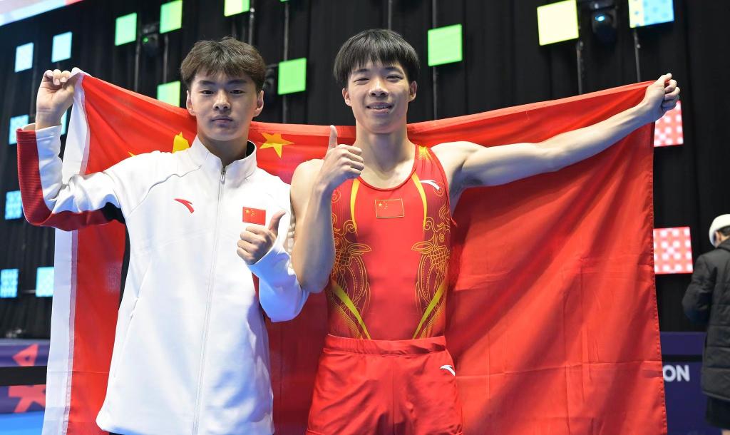 11月12日,王梓賽(左)與嚴(yán)浪宇在賽后合影。圖片來自國(guó)際體操聯(lián)合會(huì)官方社交媒體賬號(hào)
