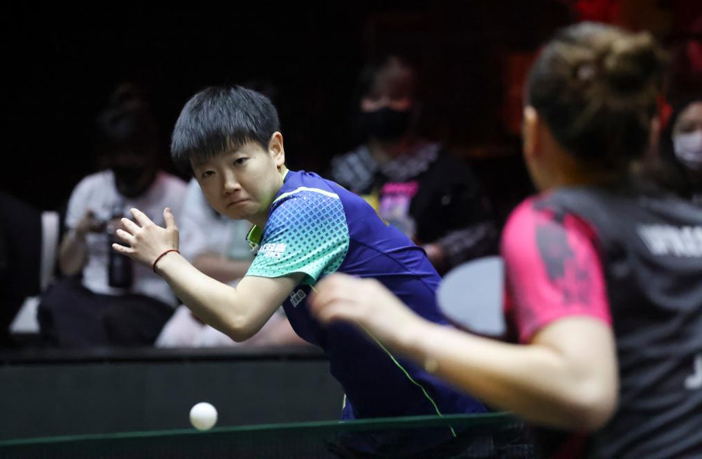 5月7日,中國選手孫穎莎在比賽中回球,她在女單第二輪比賽中3比0戰(zhàn)勝塞爾維亞選手盧普列斯庫,晉級16強。新華社記者 王海洲 攝