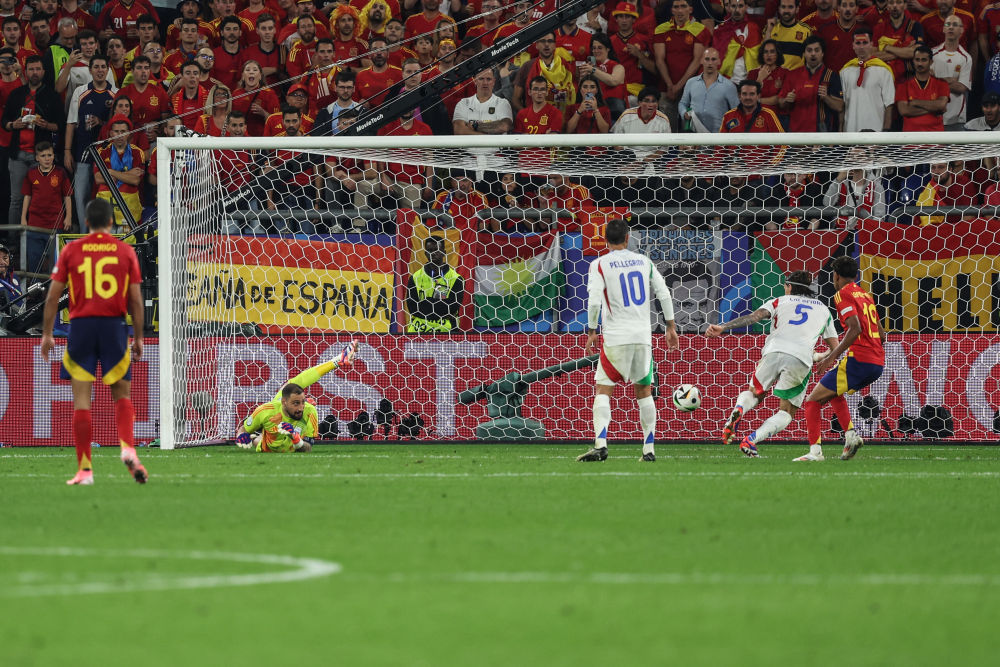 下半場西班牙隊延續(xù)攻勢,威廉姆斯繼續(xù)成為球隊爆點(diǎn),與他對位的意大利隊邊后衛(wèi)迪洛倫佐苦不堪言。第55分鐘,威廉姆斯邊路傳中,莫拉塔前點(diǎn)頭球攻門被唐納魯馬單掌撲出,但意大利隊后衛(wèi)卡拉菲奧里避閃不及自擺烏龍,“斗牛士”軍團(tuán)1:0領(lǐng)先。