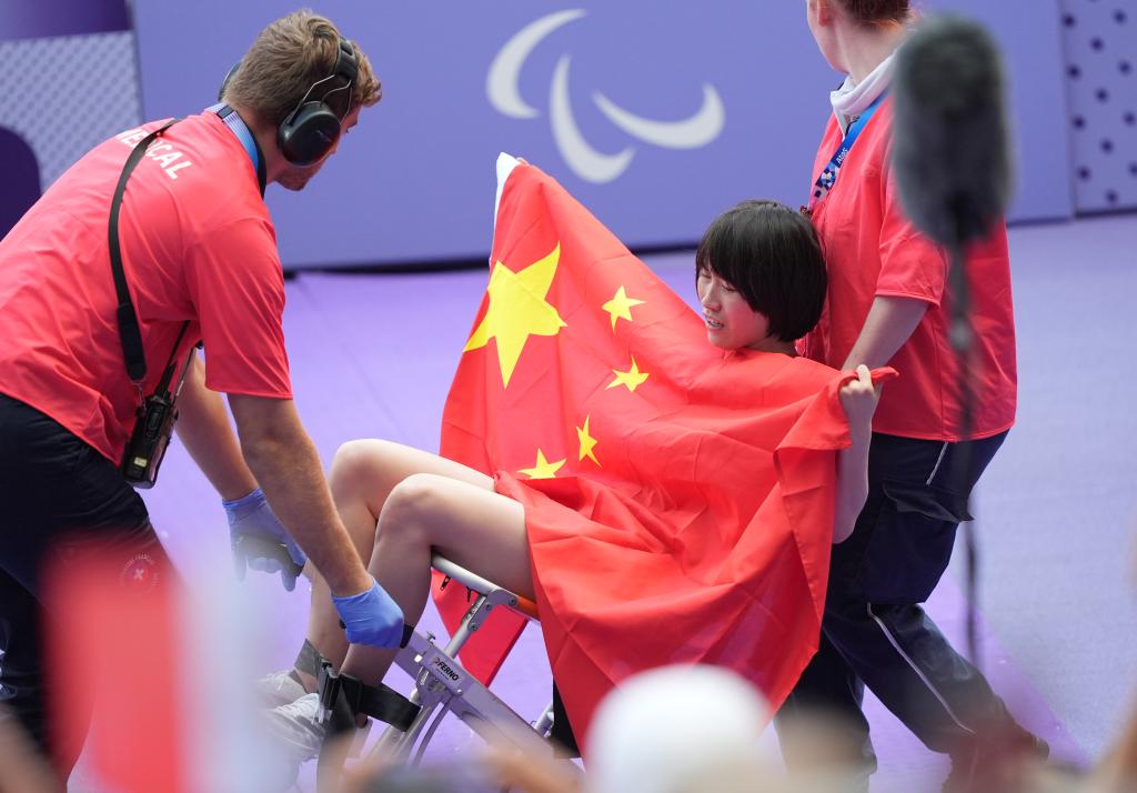 9月1日,中國選手史逸婷賽后在醫(yī)護人員的幫助下離場。新華社記者 才揚 攝