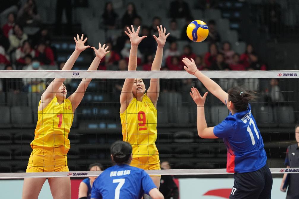 11月27日,山東隊(duì)球員李晨瑄(中)、李美君(左)在比賽中攔網(wǎng)。當(dāng)日,在湖南省長(zhǎng)沙市賀龍?bào)w育館舉行的中華人民共和國(guó)第一屆青少年三大球運(yùn)動(dòng)會(huì)排球女子決賽中,山東隊(duì)3比0戰(zhàn)勝江蘇隊(duì),獲得冠軍。新華社記者 薛宇舸 攝