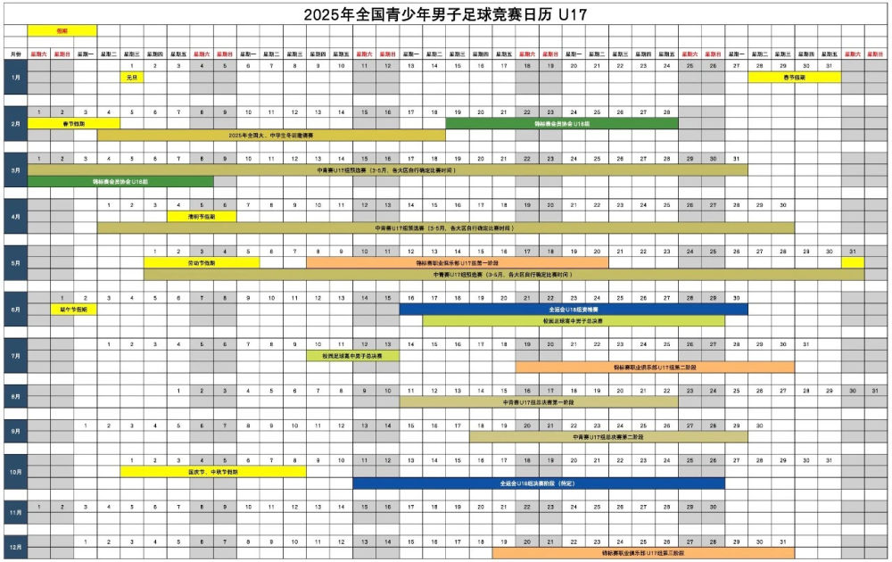 中國足協(xié)此次發(fā)布的統(tǒng)一賽歷涉及男子U13至U18共6個(gè)年齡段和女子U14至U18共5個(gè)年齡段的球員,包含中青賽、體校杯、職業(yè)俱樂部梯隊(duì)的比賽、校園足球高中男女總決賽等。不同賽事用不同顏色標(biāo)注,在表格中一目了然。中國足協(xié)青少部負(fù)責(zé)人程旭表示,這份賽歷是各部門共同推進(jìn)的結(jié)果,不僅有助于賽事統(tǒng)籌和優(yōu)化,也能更好地凝聚力量,完善人才培養(yǎng)。
