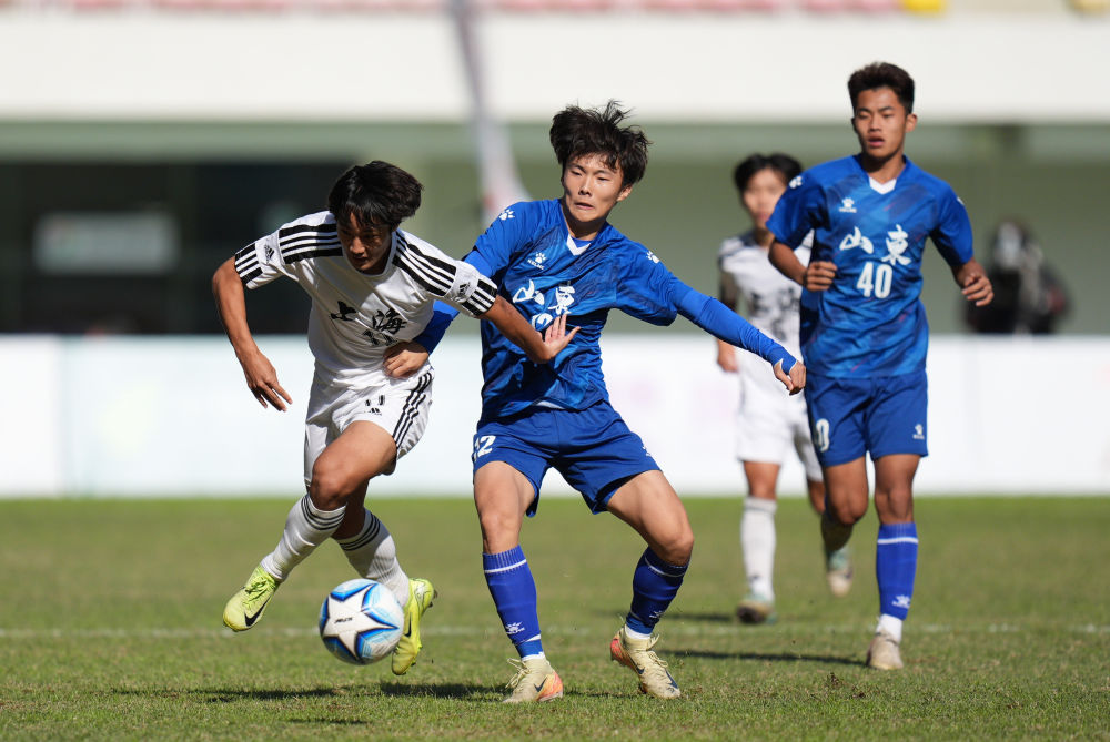 2024年11月27日,上海隊(duì)球員張俊杰(左一)和山東隊(duì)球員郝富博在第一屆全國青少年三大球運(yùn)動(dòng)會(huì)足球項(xiàng)目男子金牌賽中拼搶。新華社記者 薛宇舸 攝