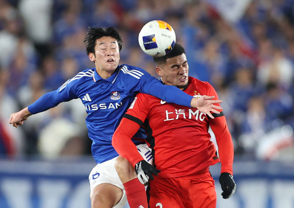 3月11日,上海海港隊(duì)球員蔣光太(右)與橫濱水手隊(duì)球員淺田大翔在比賽中爭頂。新華社記者 賈浩成 攝