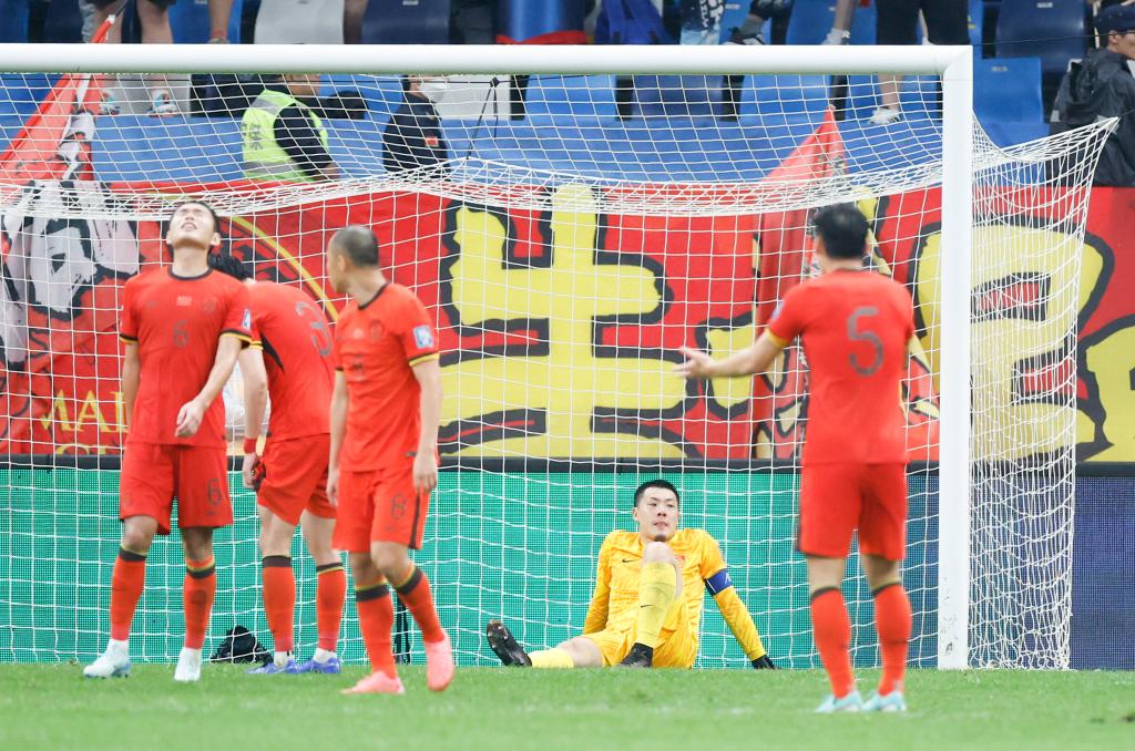 2024年9月10日,中國(guó)隊(duì)守門員王大雷(下)在球隊(duì)失球后。當(dāng)日,中國(guó)隊(duì)主場(chǎng)1比2不敵沙特隊(duì)。新華社記者 曹燦 攝