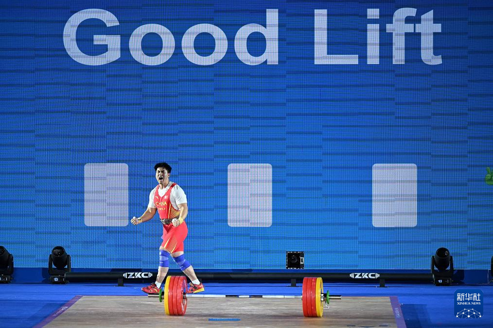 5月13日,中國(guó)選手錢(qián)飛翔在挺舉比賽中慶祝最后一次試舉成功。最終,他獲得抓舉、挺舉兩項(xiàng)季軍和總成績(jī)第四名。新華社記者 侯昭康 攝