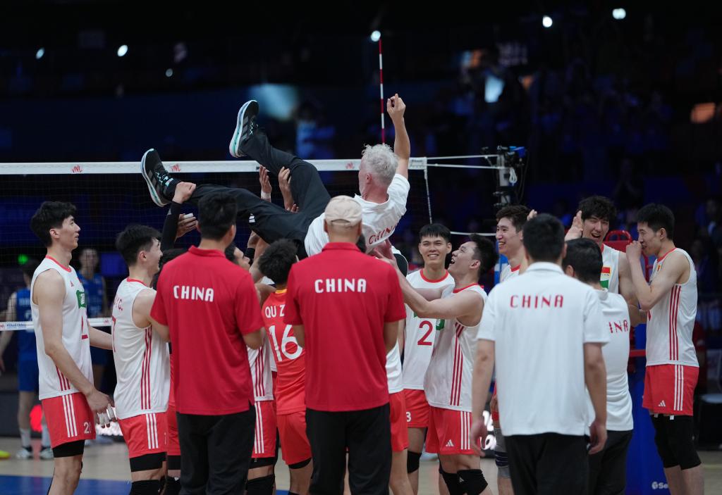 6月12日,中國隊球員在比賽后拋起主教練海寧(上)慶祝。新華社記者 李一博 攝