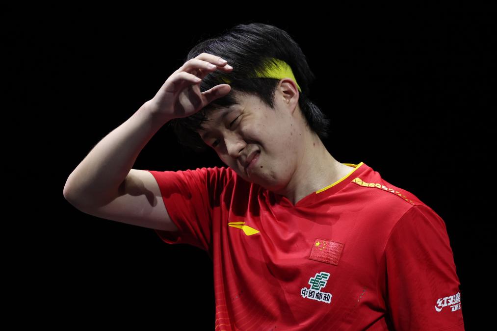 男單決賽在中國(guó)選手王楚欽和日本選手張本智和之間進(jìn)行。圖為王楚欽在比賽中失分后。新華社記者 賈浩成 攝