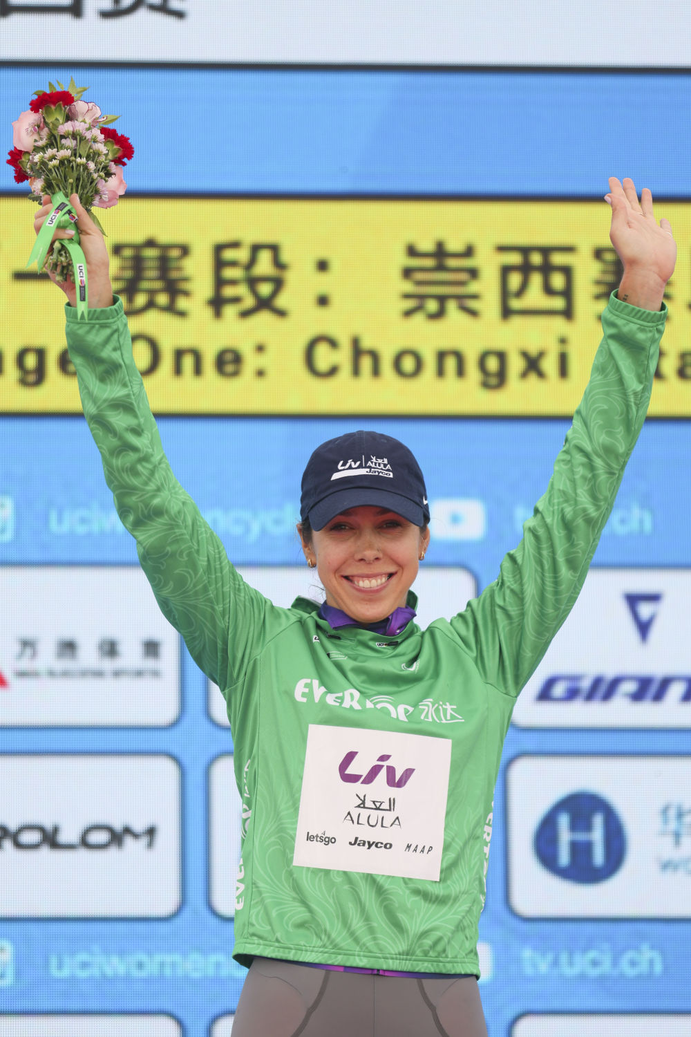 10月14日,麗芙-埃爾奧拉-杰科車隊(duì)澳大利亞車手貝克身著代表沖刺總積分第一名的綠衫在頒獎儀式上慶祝。新華社記者 王翔 攝