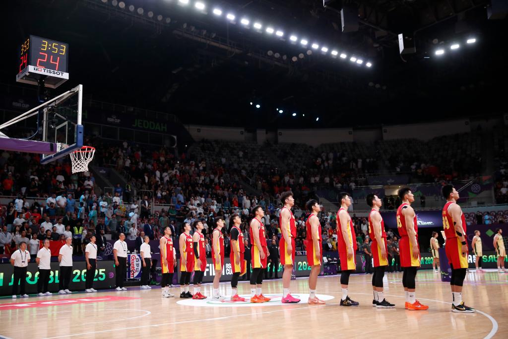 8月17日,在沙特阿拉伯吉達(dá)舉行的2025國(guó)際籃聯(lián)亞洲杯決賽中,中國(guó)隊(duì)89比90不敵澳大利亞隊(duì),獲得亞軍。圖為中國(guó)隊(duì)球員在賽前奏唱國(guó)歌儀式上列隊(duì)。新華社記者 王東震 攝