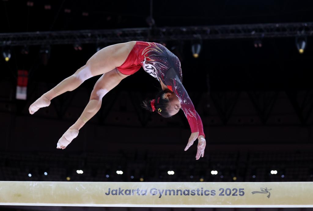 10月25日,中國選手張清穎在2025年國際體操聯(lián)合會(FIG)競技體操世錦賽女子平衡木決賽中奪得冠軍。新華社記者 白雪飛 攝