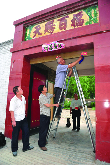 圖為陽明堡鎮(zhèn)東關村老黨員賈治安亮出“共產黨員戶”標牌。