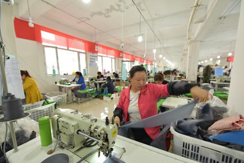 下茹越鄉(xiāng)的貧困戶蘇金娥是這家工廠的員工,“以前沒有工作,家里頭也挺困難,這會兒政府開設這個項目,我就過來試試,結(jié)果也挺好...這里有師傅教,每天可以學習...這幾天也熟練啦,每天可以做100多件,今年肯定能脫貧?!辈簧蒲赞o的蘇金娥在提到這份工作時滿臉笑容,斷斷續(xù)續(xù)的敘述中可以感受到她那喜悅的心情。