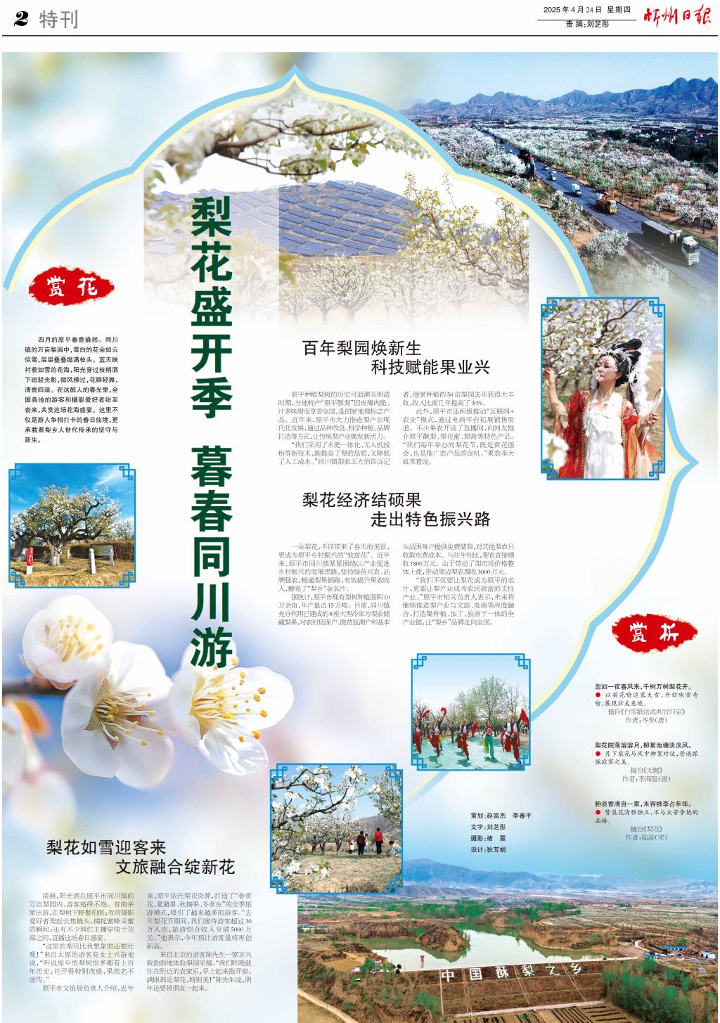 四月的原平春意盎然。同川鎮(zhèn)的萬(wàn)畝梨園中,雪白的花朵如云似雪,層層疊疊綴滿枝頭。藍(lán)天映襯著如雪的花海,陽(yáng)光穿過(guò)枝梢灑下斑駁光影,微風(fēng)拂過(guò),花瓣輕舞,清香四溢。在這醉人的春光里,全國(guó)各地的游客和攝影愛好者紛至沓來(lái),共賞這場(chǎng)花海盛宴。這里不僅是游人爭(zhēng)相打卡的春日仙境,更承載著梨鄉(xiāng)人世代傳承的堅(jiān)守與新生。
