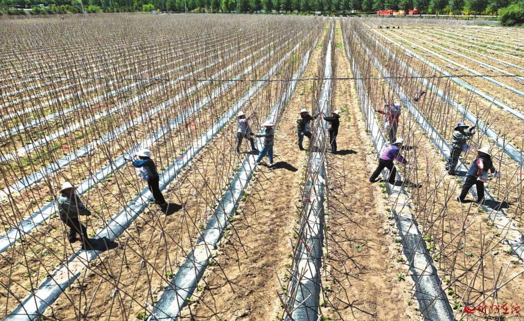 靜樂縣無絲豆角豐潤村種植基地內,農(nóng)民們正在加緊給豆角搭架子。本報記者 宮愛文攝