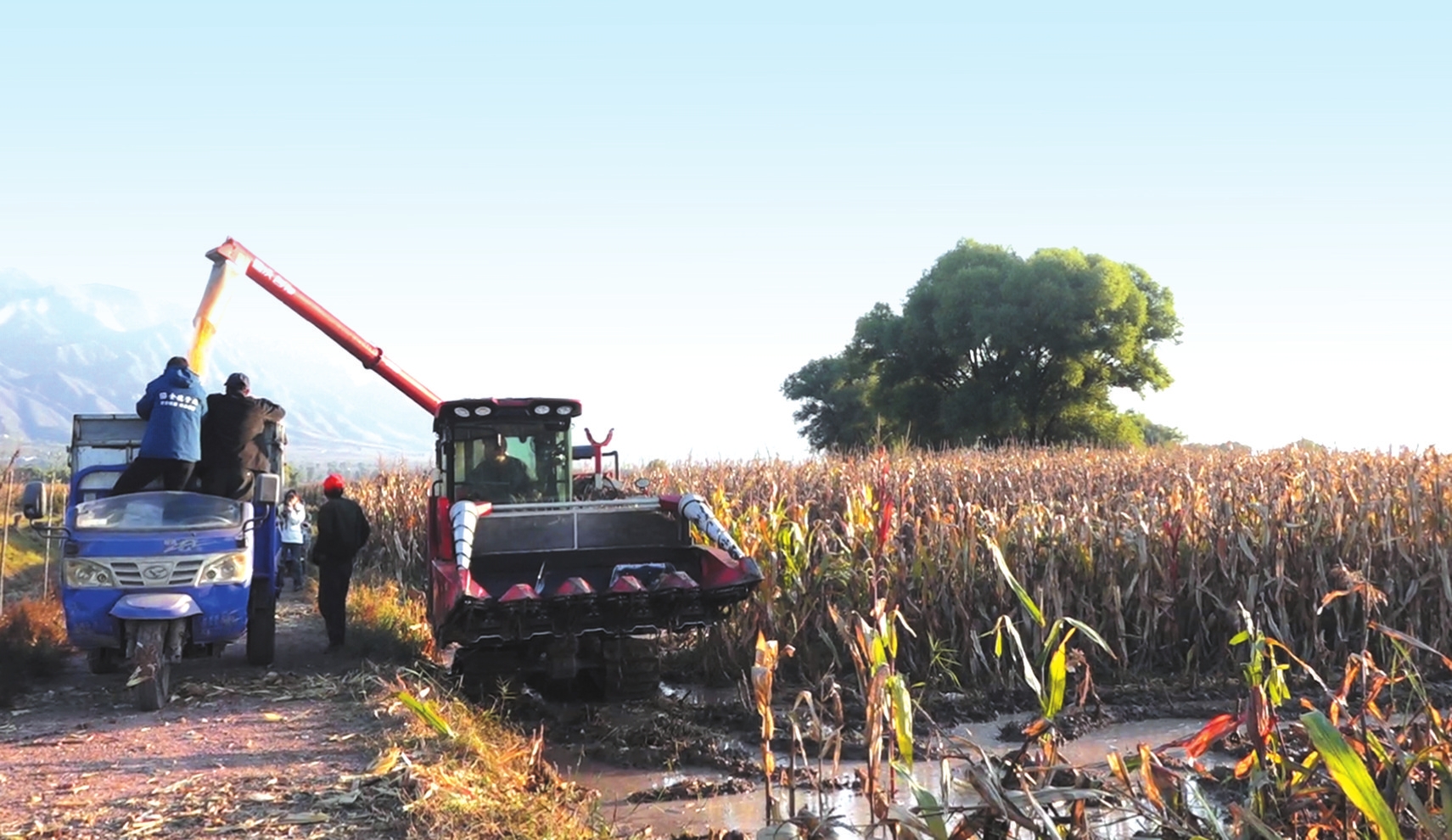 “突突”的引擎聲在濕漉漉的玉米地里轟鳴,來回穿梭中,金色的玉米在“吞吐”下脫粒,隨后如溪流般源源不斷地傾瀉而出,精準地落入一旁等候的運輸車廂內,瞬間堆起了一座座豐收的小山。