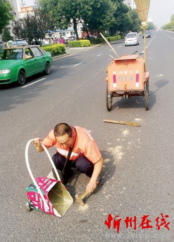 7月22日中午,忻州城區(qū)和平街,烈日當(dāng)頭,車水馬龍。這時記者看到在忻州師范學(xué)院路段,一位環(huán)衛(wèi)工人手執(zhí)小鐵錘,一絲不茍蹲在馬路上敲打撒落在路面上的粘泥,然后再用掃帚認真清理干凈。這種敬業(yè)精神,值得大家學(xué)習(xí)。(赫在榮 攝)