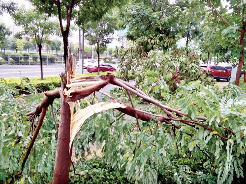 7月15日下午,忻州城區(qū)遭遇一場(chǎng)突如其來的暴風(fēng)雨襲擊,致使局部地區(qū)出現(xiàn)樹木被刮倒、樹枝被折斷、車輛被劃傷的現(xiàn)象。圖為忻州城區(qū)惠民小區(qū)院外道路邊的景觀樹被刮折。(魯明強(qiáng) 攝)