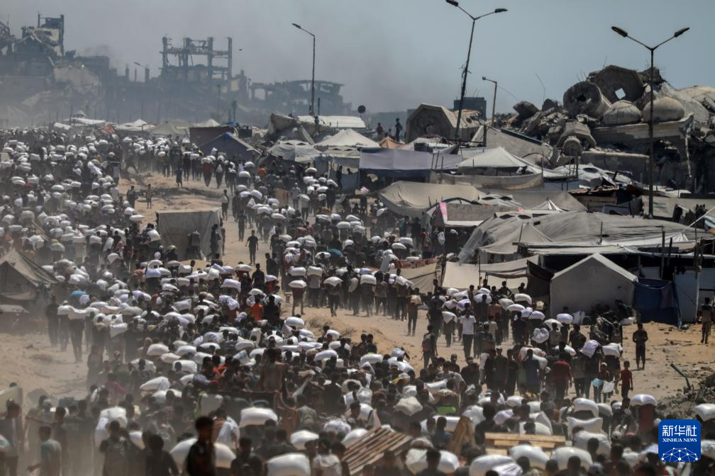 7月27日,在加沙地帶北部城鎮(zhèn)拜特拉希亞,人們領(lǐng)取通過邊境口岸進入加沙的援助物資。新華社發(fā)(里澤克·阿卜杜勒賈瓦德攝)