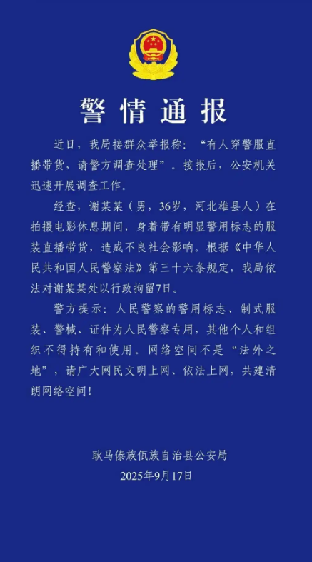 近日,演員謝孟偉(網(wǎng)絡(luò)俗稱“嘎子哥”)在直播帶貨過程中身穿警服,被公安機(jī)關(guān)依法處以行政拘留七日的處罰。該處理結(jié)果獲得輿論普遍支持,體現(xiàn)出社會(huì)對公權(quán)力象征符號神圣性的共同維護(hù)。據(jù)通報(bào),謝某在電影拍攝休息期間,身著配有警用標(biāo)志的制式警服公開推銷電子產(chǎn)品,并聲稱“穿警服需通過政審”“公安機(jī)關(guān)應(yīng)當(dāng)配合工作”,企圖利用警服所承載的公信力為其商業(yè)行為背書。