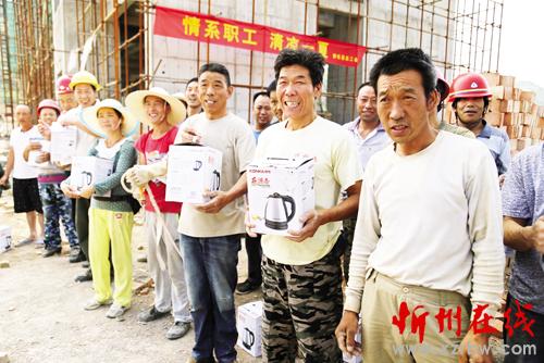 圖為靜樂縣工會(huì)為該縣殘疾人康復(fù)和托養(yǎng)中心工程施工現(xiàn)場工人發(fā)放熱水壺。