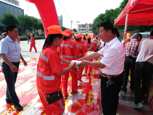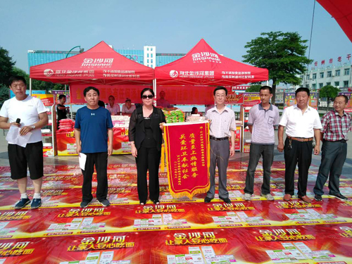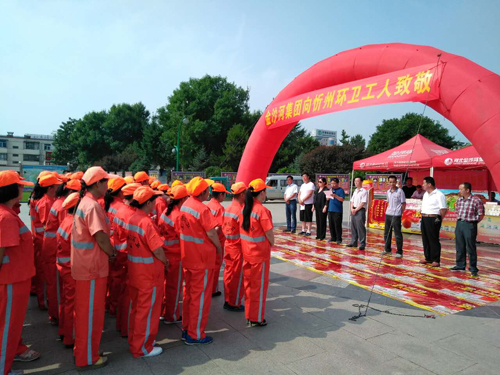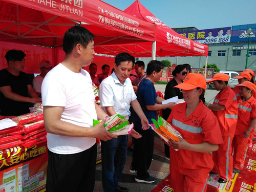 本網(wǎng)訊 7月16日上午,忻府區(qū)華琳食品有限公司在體育廣場舉辦“金沙河集團(tuán)向忻州環(huán)衛(wèi)工人致敬”的慰問活動。向忻州約1300名環(huán)衛(wèi)工人捐贈“金沙河”牌掛面、刀削面等食品,捐贈價值達(dá)上萬元。
