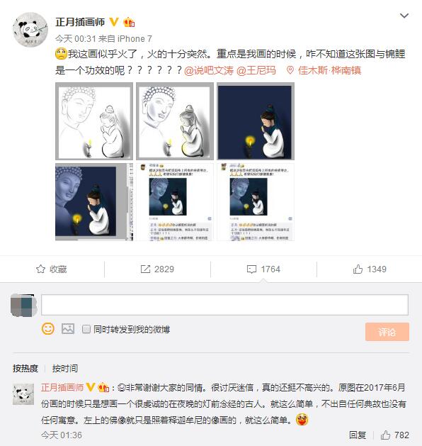 關(guān)于這張畫上的佛像到底是不是地藏菩薩,網(wǎng)友各說各話直到現(xiàn)在還有人在糾結(jié)。而其實,插畫的原創(chuàng)作者@正月插畫師早在今天凌晨00:31分就已經(jīng)作出說明:畫的只是一個夜晚在燈前念經(jīng)的古人,佛像照釋迦摩尼所畫,不出自任何典故也沒有任何寓意!