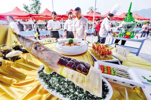 竹筍是杭州市臨安區(qū)的經濟主產業(yè),被稱為臨安農民的第一棵“搖錢樹”。“百筍宴”是臨安傳統(tǒng)的特色名宴,被認定為“中華特色名宴”,其包含的與竹筍有關的數(shù)百道筍菜佳肴,凝聚著濃厚的吳越美食文化。這是“百筍宴”活動現(xiàn)場展示的與筍有關的特色菜肴據(jù)新華社 記者 徐 昱 攝