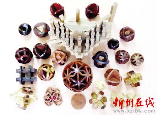 卯竅傳奇——五十六民族大團結:是用56塊木頭做的一個球體,每一塊木頭都是用卯竅連接,卯竅結構異常復雜。外形為祿福圖案,寓意56個民族大團結,天祿地祿人間福。它的種類有80多種,做一個得兩個多月的時間。