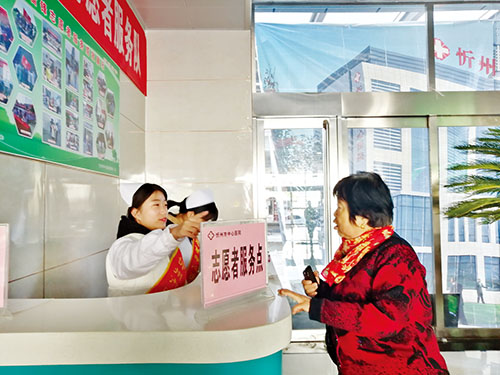 本報訊(實習(xí)記者 王菲)“大姐,您是哪里不舒服?”“我是來做檢查的,慢性病是在哪看呢?”“這個不在咱們這棟樓,我陪您過去吧?!痹谛弥菔兄行尼t(yī)院的門診大廳,一位大姐看到大廳里人來人往,不知道該到幾樓找哪位醫(yī)生看病,志愿者見狀,快步走上前去,面帶微笑地與大姐打招呼,并很快帶著大姐去了就診區(qū)。