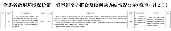 截止2017年6月3日10時,省委省政府環(huán)境保護(hù)第一督察組向我市交辦群眾反映問題六批,共計33件。其中,按重要性劃分,重點群眾反映問題11件、一般群眾反映問題22件;按區(qū)域分,忻府區(qū)14件、開發(fā)區(qū)1件、原平市3件、保德縣3件、寧武縣1件、五臺縣1件、河曲縣1件、定襄縣3件、岢嵐縣1件、代縣2件、靜樂1件、神池1件、市住建局1件;按污染類型分,大氣20件、水8件、垃圾6件、固廢1件、噪聲8件、生態(tài)3件、光1件、其他3件。目前已辦結(jié)第一批(1件)群眾反映問題,對3名相關(guān)責(zé)任人進(jìn)行了約談,對1名相關(guān)責(zé)任人進(jìn)行了黨紀(jì)政紀(jì)處分。