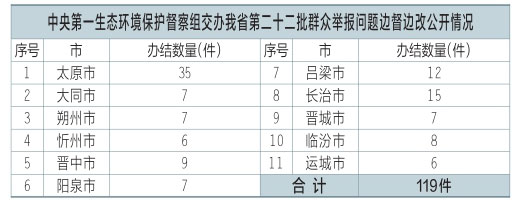 中央第一生態(tài)環(huán)境保護督察組交辦我省第二十二批群眾舉報問題119件,辦結(jié)119件。公示119件,其中太原市35件、大同市7件、朔州市7件、忻州市6件、晉中市9件、陽泉市7件、呂梁市12件、長治市15件、晉城市7件、臨汾市8件、運城市6件。可登錄山西省人民政府網(wǎng)站或掃描二維碼查閱群眾信訪舉報轉(zhuǎn)辦和邊督邊改公開情況一覽表。