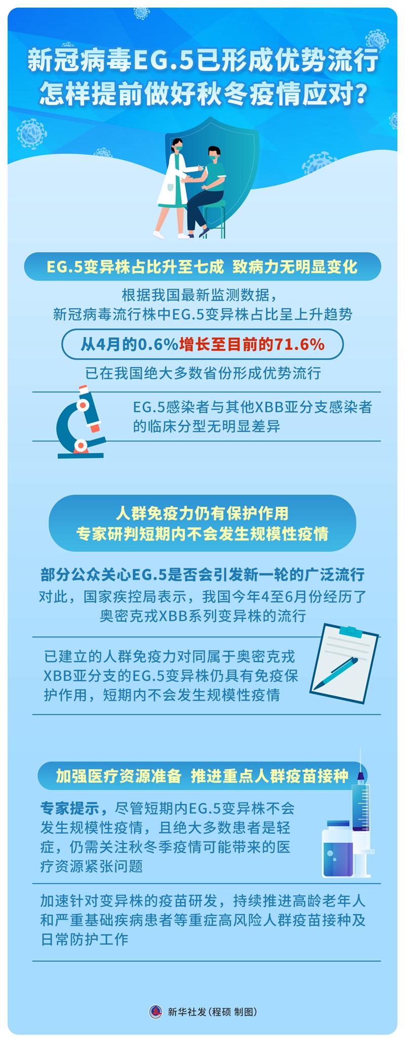 專家提示,盡管短期內(nèi)EG.5變異株不會(huì)發(fā)生規(guī)模性疫情,且絕大多數(shù)患者是輕癥,仍需關(guān)注秋冬季疫情可能帶來的醫(yī)療資源緊張問題,加速針對變異株的疫苗研發(fā),持續(xù)推進(jìn)高齡老年人和嚴(yán)重基礎(chǔ)疾病患者等重癥高風(fēng)險(xiǎn)人群疫苗接種及日常防護(hù)工作。