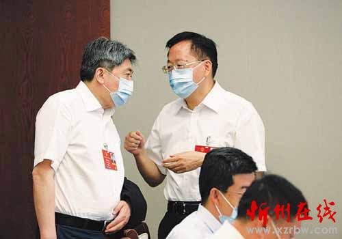圖為忻州市長(zhǎng)朱曉東代表(左)和劉予強(qiáng)代表在交流。