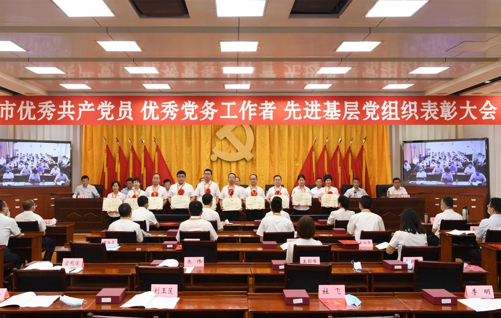 上午8時30分,大會正式開始,全體起立,奏唱國歌。來自全市各行各業(yè)、在工作中取得優(yōu)異成績的99名共產(chǎn)黨員、100名黨務(wù)工作者和100個基層黨組織,分別被授予“全市優(yōu)秀共產(chǎn)黨員”“全市優(yōu)秀黨務(wù)工作者”“全市先進基層黨組織”榮譽稱號。受到表彰的優(yōu)秀個人和先進集體代表先后上臺領(lǐng)獎,會場響起熱烈掌聲。
