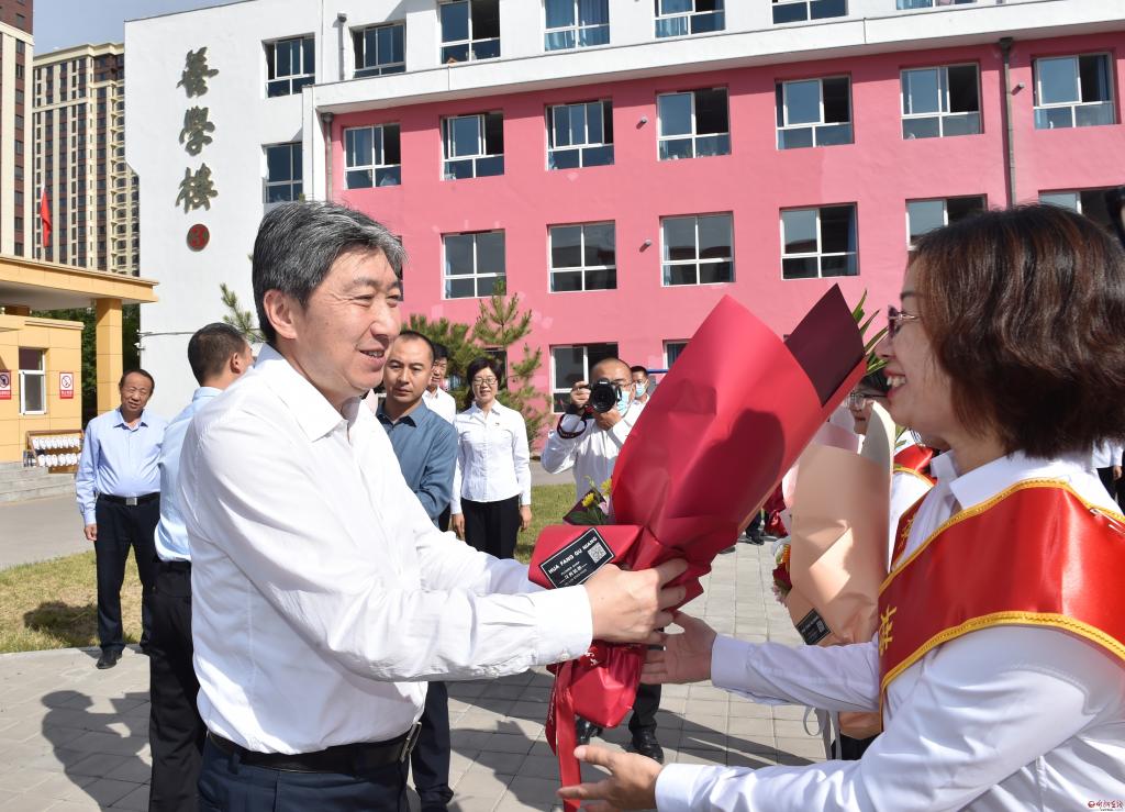 每到一處,朱曉東都與教師們深入交流,了解學校建設(shè)發(fā)展情況,關(guān)切詢問他們的工作生活情況,感謝他們?yōu)槲沂薪逃聵I(yè)發(fā)展作出的貢獻,并為優(yōu)秀教師代表送上了鮮花,祝他們節(jié)日快樂。朱曉東指出,新一屆省委、省政府作出構(gòu)建“一群兩區(qū)三圈”城鄉(xiāng)區(qū)域發(fā)展新格局的重大戰(zhàn)略部署,明確提出“強勢打造太忻一體化經(jīng)濟區(qū)北引擎,引領(lǐng)帶動忻州與太原、雄安新區(qū)相向發(fā)展,打造我省融入京津冀和服務雄安新區(qū)的重要走廊”,賦予忻州“建設(shè)開放發(fā)展前沿城市”的戰(zhàn)略定位,忻州發(fā)展迎來了前所未有、千載難逢的重大機遇。不論是太忻一體化經(jīng)濟區(qū)建設(shè),還是建設(shè)開放發(fā)展前沿城市,都離不開人才的支撐。希望廣大教育工作者身在學校、心系全局,秉持“負責任、動腦筋、講良心”的工作要求,潛心教學鉆研、立德樹人,以更加飽滿的熱情投身教育事業(yè),為忻州經(jīng)濟社會發(fā)展培養(yǎng)更多的優(yōu)秀人才。