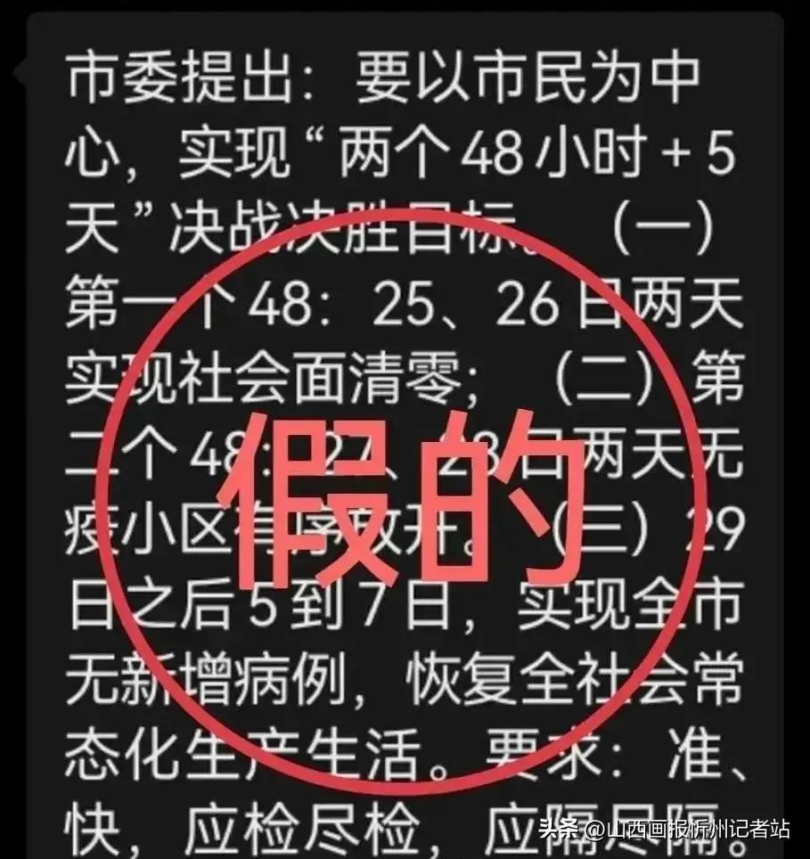 近日,多個微信群都在熱傳這樣一條消息。內(nèi)容為:市委提出:要以市民為中心,實現(xiàn)“兩個48小時+5天”決戰(zhàn)決勝目標。(一)第一個48:25、26日兩天實現(xiàn)社會面清零;(二)第二個48:27、28日兩天無疫小區(qū)有序放開。(三)29日之后5到7日,實現(xiàn)全市無新增病例,恢復(fù)全社會常態(tài)化生產(chǎn)生活。要求:準、快,應(yīng)檢盡檢,應(yīng)隔盡隔。