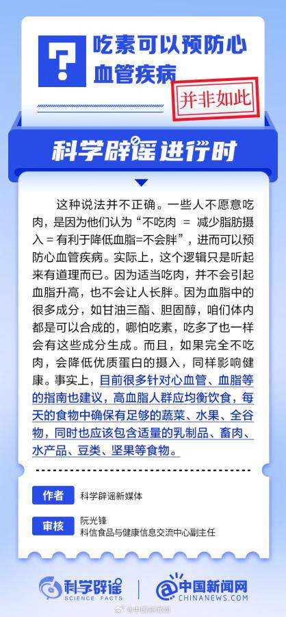 一些人不愿意吃肉,是因為他們認為“不吃肉=減少脂肪攝入=有利于降低血脂=不會胖”,進而可以預(yù)防心血管疾病。實際上,這個邏輯只是聽起來有道理而已。因為適當吃肉,并不會引起血脂升高,也不會讓人長胖。如果完全不吃肉,會降低優(yōu)質(zhì)蛋白的攝入,同樣影響健康。(來源:@科學(xué)辟謠 中國新聞網(wǎng)微博)