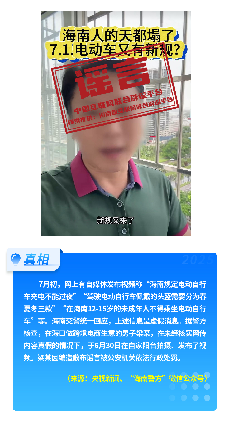 有人重新翻炒“醫(yī)保‘個人賬戶’將全部取消”舊謠,故意歪曲醫(yī)保改革真實(shí)內(nèi)涵,嚴(yán)重誤導(dǎo)公眾對醫(yī)保改革政策的理解。“有專人上門服務(wù)激活醫(yī)保碼”,披著“公共服務(wù)”的外衣,實(shí)有詐騙之嫌和安全風(fēng)險。憑空捏造“海南規(guī)定電動自行車充電不能過夜、頭盔分三季”這一“奇葩規(guī)定”,以“新規(guī)”話術(shù),擾亂交通管理秩序。