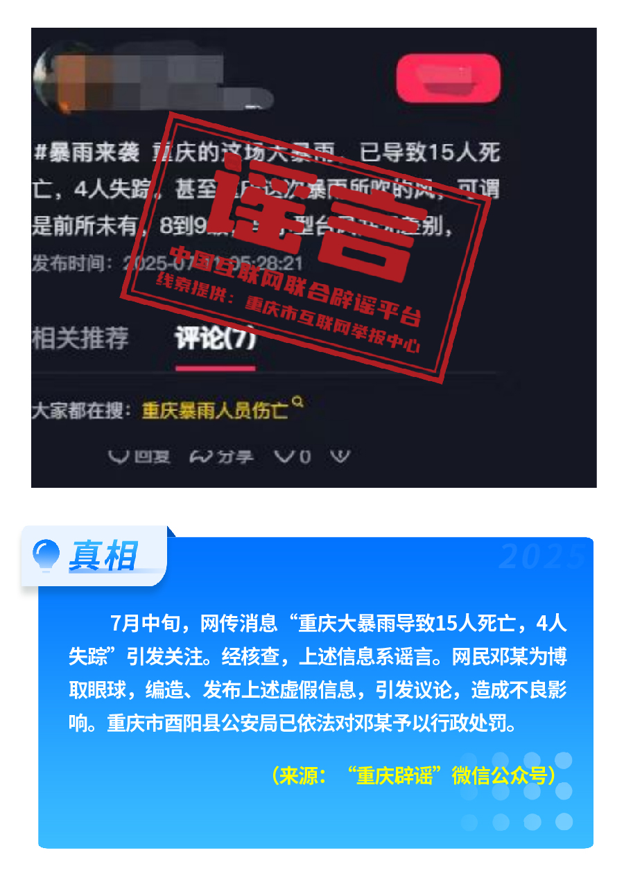 近期,網(wǎng)上接連出現(xiàn)發(fā)布虛假“警情通報”的惡性造謠傳謠案件,炮制傳播“昆明駕車撞人案131人死亡”“杭州自來水接入糞水”及涉釋永信虛假“警情通報”,模仿“藍(lán)底白字”格式,杜撰聳人聽聞細(xì)節(jié),損害政府公信力,嚴(yán)重擾亂社會秩序?!霸菏款A(yù)測廣東將發(fā)生8級以上大地震”公然偽造專家聊天截圖,謊報地震預(yù)警。還有造謠者借盛夏高溫酷暑與洪澇災(zāi)害,編造“安徽淮北、山東泰安等地多人因高溫死亡” “重慶大暴雨導(dǎo)致15人死亡、4人失蹤”等謠言,蹭炒熱點(diǎn)、煽動情緒。