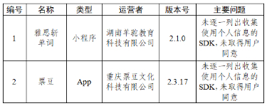 二、雅思斬單詞、票豆等2款A(yù)pp未逐一列出收集使用個(gè)人信息的SDK,未取得用戶同意(詳見(jiàn)下表)。