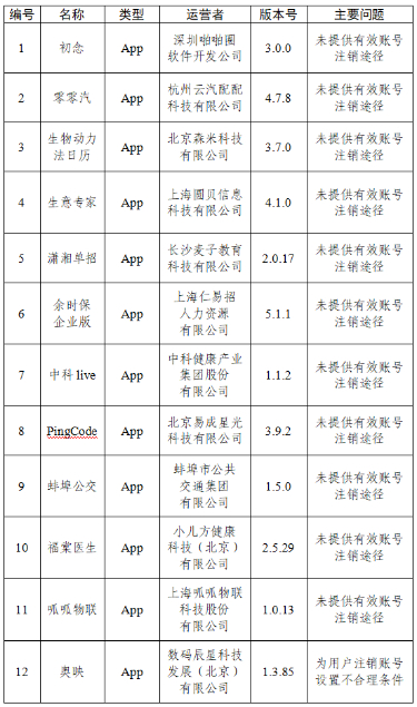 四、初念、零零汽等12款A(yù)pp未提供有效賬號(hào)注銷途徑或?yàn)橛脩糇N賬號(hào)設(shè)置不合理?xiàng)l件(詳見(jiàn)下表)。
