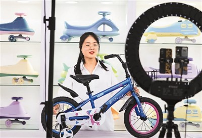 河北省邢臺市廣宗縣鐵牛自行車業(yè)有限公司的工作人員日前通過線上廣交會直播推介童車產(chǎn)品。王 壘攝(人民圖片)