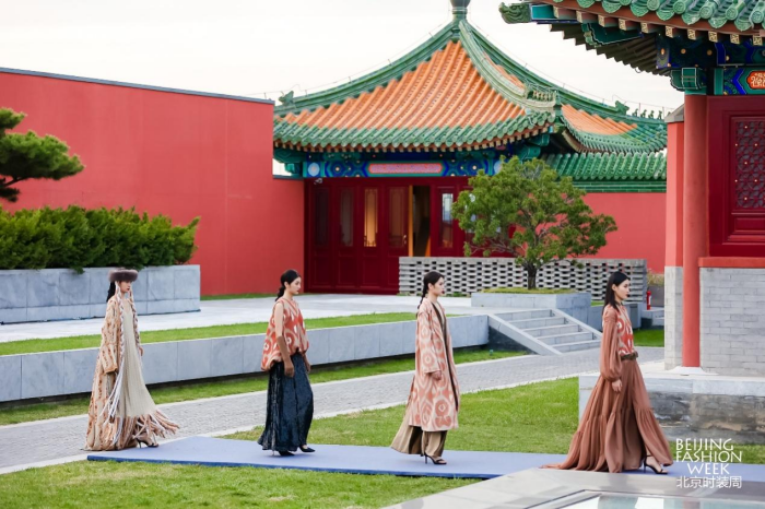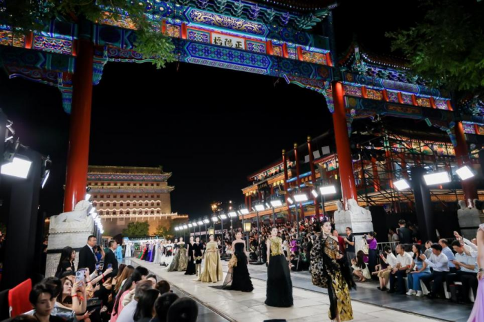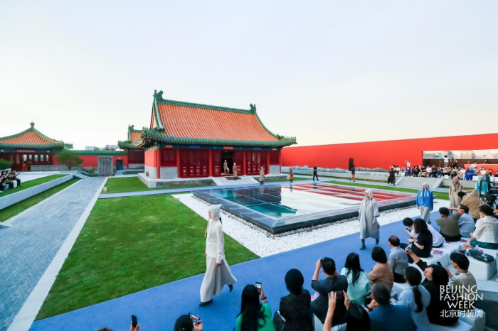 城市即秀場(chǎng),穿越古今的時(shí)尚力量 文化寄存于城市之間,時(shí)尚產(chǎn)業(yè)與文化相伴相生。北京獨(dú)特的文化氛圍讓時(shí)尚產(chǎn)業(yè)扎根于肥沃的傳媒土壤,在城市中間探尋時(shí)尚的秀場(chǎng),尋求時(shí)尚貫穿于中國(guó)人的生活之間方方面面的具象體現(xiàn)。城市獨(dú)有的文化氛圍讓時(shí)尚發(fā)布有了新的錨點(diǎn),融身于市井阡陌的模特們,于文化之都鑄造時(shí)尚之魂,煥發(fā)時(shí)尚生機(jī)。 本屆北京時(shí)裝周圍繞“IN 北京 潮有范兒”的全新主題,打破封閉的空間藩籬,涵蓋潮流發(fā)布、主題論壇、專業(yè)賽事、時(shí)尚展覽多項(xiàng)活動(dòng),于王府井、前門大街、望京小街等地標(biāo)構(gòu)建“以城為景”的生態(tài)秀場(chǎng)。此次時(shí)裝周于前門大街以“點(diǎn)亮中軸線”大秀開(kāi)幕,歷經(jīng)8天數(shù)十場(chǎng)活動(dòng),最后在王府井大街以“與美相織”大秀落下帷幕。 特別是在東城區(qū)新文化地標(biāo)——隆福文化中心舉辦的艾德萊斯時(shí)尚大秀和“地球第三極”西藏毛紡織品牌大秀都各具特色?;诿褡寮y飾設(shè)計(jì)的兩場(chǎng)大秀,在新國(guó)潮的聚集地隆福寺展開(kāi),以古樸的紅墻青磚為映襯。我國(guó)多位設(shè)計(jì)師為觀眾呈現(xiàn)了穿越千年的時(shí)空對(duì)話,讓傳統(tǒng)的非遺文化、民族時(shí)尚和古建筑地標(biāo)相得益彰,無(wú)不彰顯著中國(guó)時(shí)尚的文化自信。
