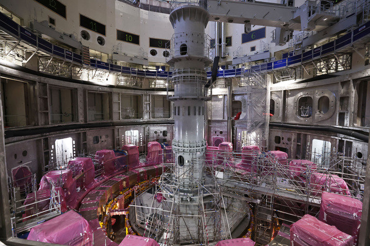 這是11月23日在位于法國圣保羅-萊迪朗斯的國際熱核聚變實驗反應(yīng)堆(ITER)建設(shè)現(xiàn)場拍攝的安裝中的托卡馬克裝置。(梁希之 攝)