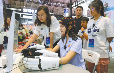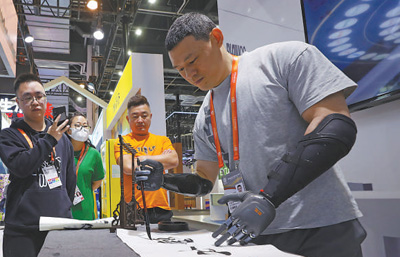 中國品牌博覽會上,工作人員用腦機科技操控的假肢寫毛筆字。新華社記者 方 喆攝