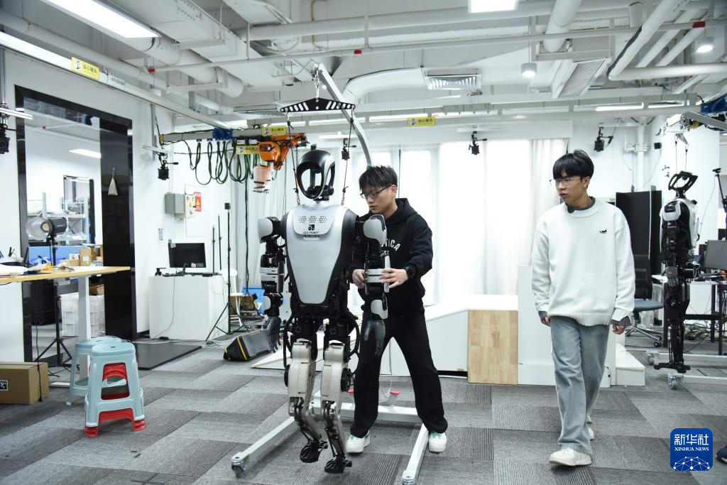 樂聚(深圳)機器人技術(shù)有限公司的兩名工作人員正在調(diào)試一臺“夸父”人形機器人(1月21日攝)。新華社記者洪澤華攝