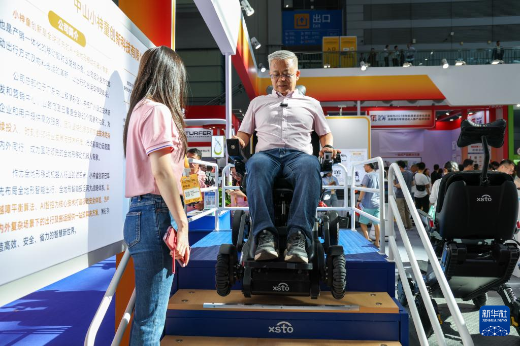 9月12日,觀眾在國際智慧養(yǎng)老產(chǎn)業(yè)博覽會(huì)現(xiàn)場體驗(yàn)智能出行機(jī)器人。新華社記者 梁旭 攝