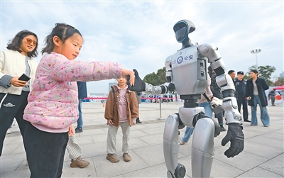 10月25日,江蘇省揚州市公安局在揚州市明月湖廣場舉行警營開放日活動,現(xiàn)場設立多個主題互動展區(qū),市民可以近距離接觸警務裝備。圖為人形機器人與小朋友互動。孟德龍攝(人民視覺)